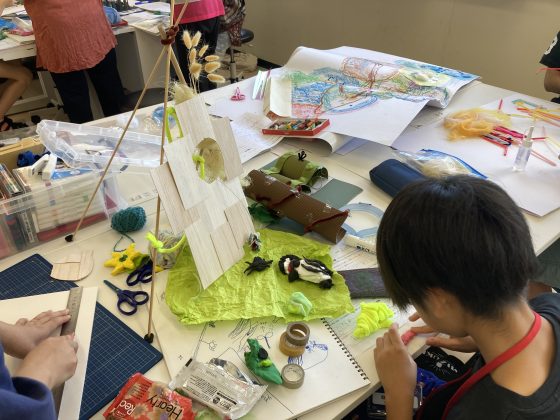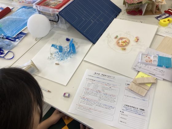 授業後半になると模型などの制作活動に夢中になるあまり、前半にフィールドワークやグループ活動でイメージを膨らませた「オノマトペ」と作品との関連が薄れてきている子が出てきました。