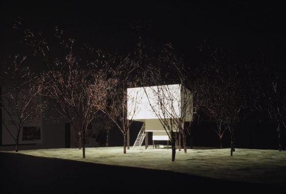 地上階の椅子と、3つの構造体がつくる大きさの異なる空間が、訪れた人のスケール感覚を狂わせ、森、風景、展示物の感じ方を多様にする仕掛けになっています。
