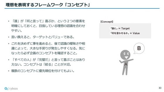 こうした共通理想を確実に共有するため、青野さんは「コンセプト」という独自の定義を提唱されました。「AさんがB」、つまり「誰に、何と言わせるか」を明確にする手法です。「良いクラスを作ろう」では曖昧ですが、「担任の先生が『お前ら仲良いな』と言うクラス」なら具体的で認識がズレません。サイボウズでは全企画書にこの形式でのコンセプト記載が必須で、従業員皆が意識的にコンセプトを確認し合う文化が根付いているのだそうです。