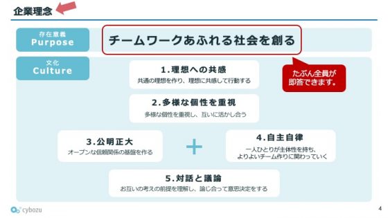 同社の方向性を決定づけた工夫として、まず青野さんがご紹介されたのは、企業理念を共有することの重要性です。同社の企業理念である「チームワークあふれる社会を創る」について、「サイボウズの社員なら全員が即答できる」と強調されます。企業運営における理念の重要性に気づいてからは、徹底的な言語化と浸透に努めてこられたのだそうです。