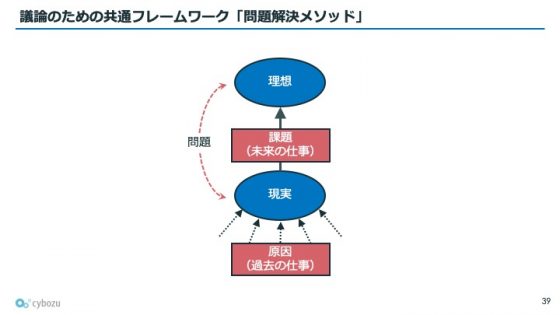 最後に、青野さんは「議論をして、次の仕事を設定するには?」という問いに答える「問題解決メソッド」を紹介されました。このフレームワークは4つの要素で構成されています。「現実」「理想」「原因」「課題」です。原因は過去の仕事によって現実を生み出したもの、課題は理想に近づくための未来の仕事を指します。