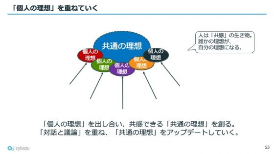 このフレームワークは、「その人がどういうふうに世界を見て、世界を動かそうとしているのかを可視化する道具」だと青野さんは強調します。「サイボウズにも色々な社員がいる。それでも建設的に話が進むのは、こうした共通言語を全員が訓練し身につけているから」なのだそうです。