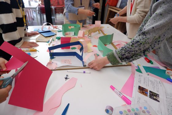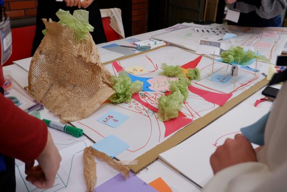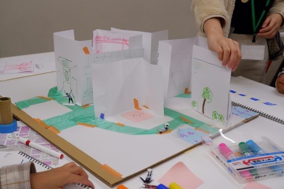 マスタープランの検討方法はグループによって様々で、担当街区のかたちの紙にペンで描き込んで考えるグループ、付箋で道とお店のあたりをつくって配置を考えるグループ、立体的に道やお店を組み立てて検討するグループ。