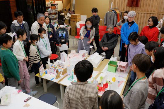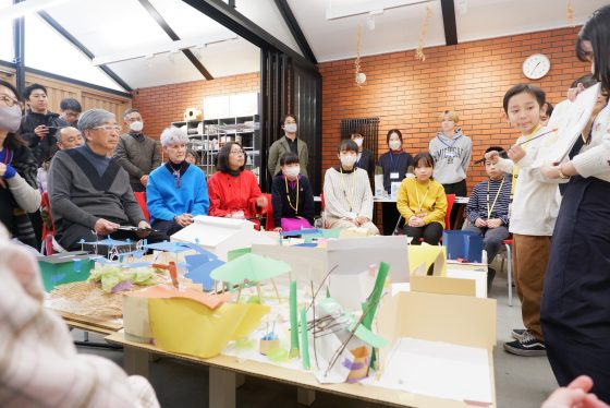 これまでつくってきた模型やスケッチを見せながらグループごとにお店の紹介や路地の特徴を発表しました。子どもたちはお店や路地の魅力や面白さを伝えようと、説明の仕方を工夫していました。各グループの発表後にはフィードバックの時間が設けられ、先生方から多くのコメントをいただきました。さらに子どもたちが一方的に説明するのではなく、先生方からの質問に答える中で、自分たちの考えを客観的に見直し、課題や改善点を明確にすることができました。